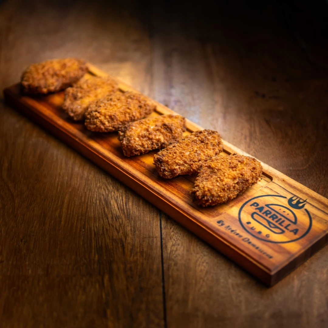 6 Asinha de frango empanada na farinha panko e frita.