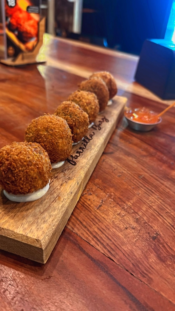 Porção de 6 unidades de bolinha de costela defumada e desfiada empanada na farinha panko e frita.